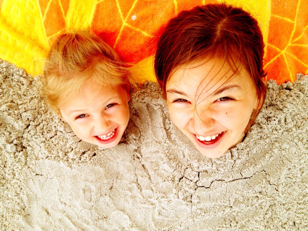 Danach sind wir an den Strand gefahren, dort hat mein Großvater mich und meine kleine Schwester bis zum Hals eingebuddelt. Das war sehr cool. Es hat sich ganz weich angefühlt. Oma und Mama mussten uns hinterher mit Handtüchern komplett entsanden.